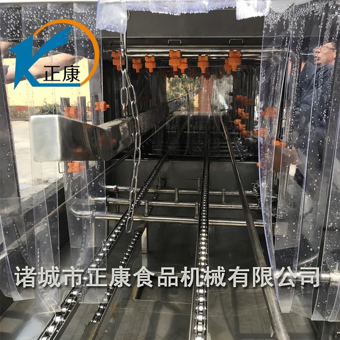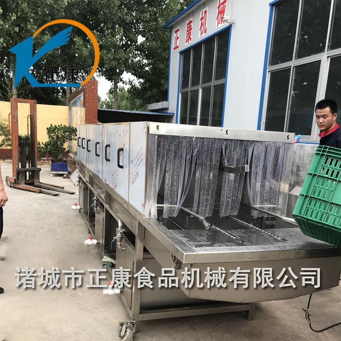 設備原理需清洗的周轉筐由不銹鋼鏈條輸入清洗機中,依次通過加溫老堿水→高壓熱水→常溫自來水→消毒水→常溫風刀去水等多道工序,將筐子清洗干凈,同時完成殺菌及風干;特殊筐子清洗時可在熱堿水清洗段后加配毛刷,對筐子底部及左右兩側進行刷洗,提高清洗效果;采用連續(xù)式清洗,以提高清洗效率;